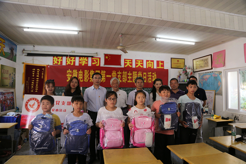 安徽电影集团第一党支部向孩子们捐献了书包、文具等物品,并为留守儿童们播放了公益微电影《榜样:叶连平——乡村中永不熄灭的烛光》和动画片《哪吒之魔童降世》。