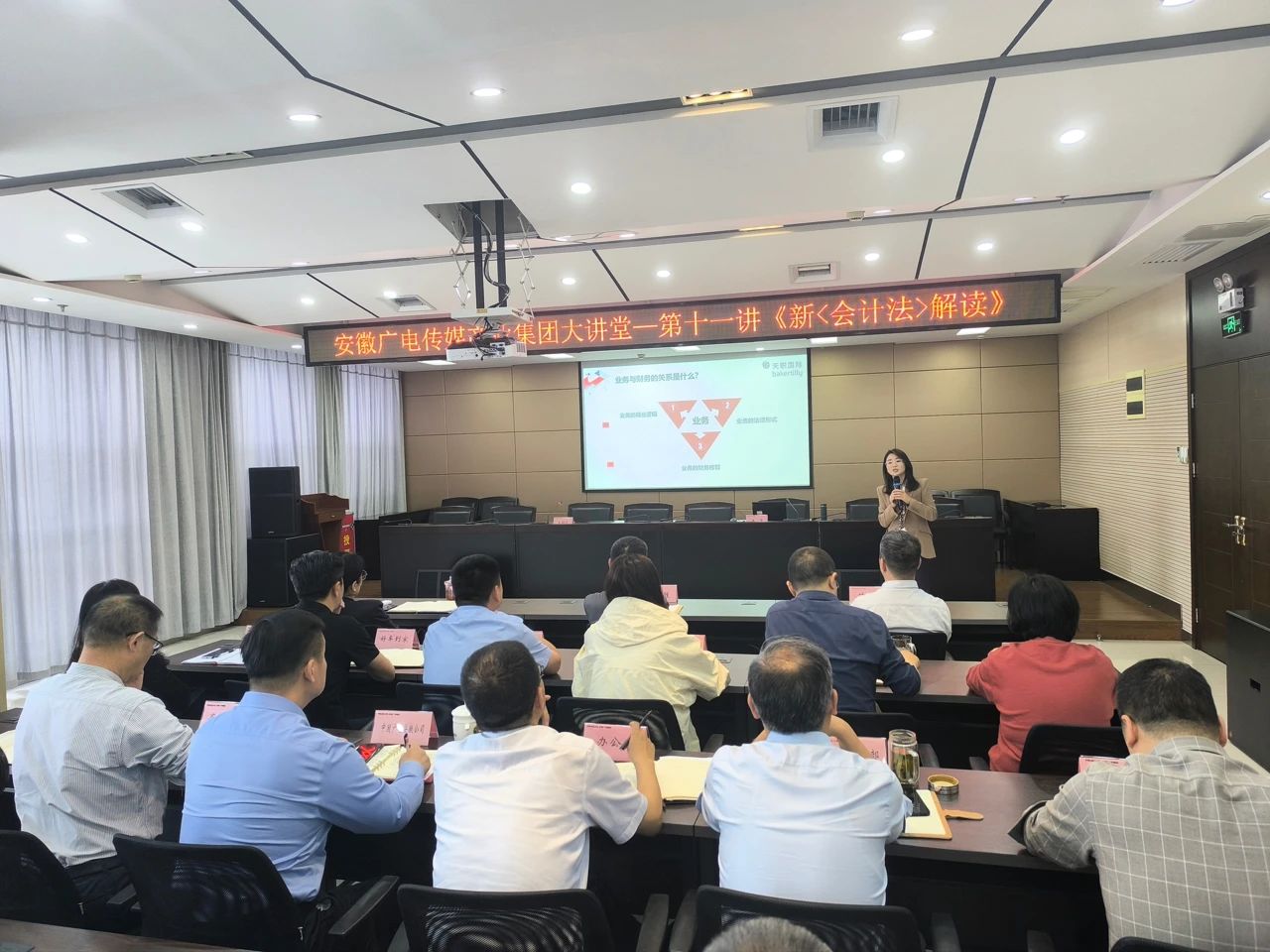 为积极适应会计政策新变化,加强财会监督、严肃财经纪律,进一步提升集团经营单元的依法合规经营意识,4月24日下午,安徽广电集团大讲堂举行第十一讲,集团外部董事王青作《新〈会计法〉解读》专题辅导。集团党委委员、董事、常务副总经理苗峰主持培训。