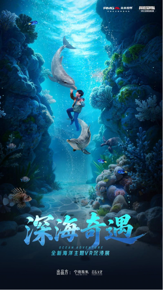 《深海奇遇》是全国首个国风深海主题沉浸式VR内容,以中华海洋奇书《海错图》与上古神话《山海经》为灵感,从海面垂直下潜,穿越波光粼粼的真光层、幽蓝神秘的暮光层,坠入完全黑暗、唯有生物荧光闪烁的无光层,最终开启神话篇章,幻化于上古神兽“鲲”,展示宇宙和生命的演化过程,畅游于《山海经》所记载的“碧海归墟”与“海天幻境”之间,30分钟电影级超逼真潜海体验,1:1还原2000余米的真实深海生态景观。这是一场东方美学幻境与海底实景交织的惊喜奇遇,一次抵达华夏文明精神源头的共鸣之旅。