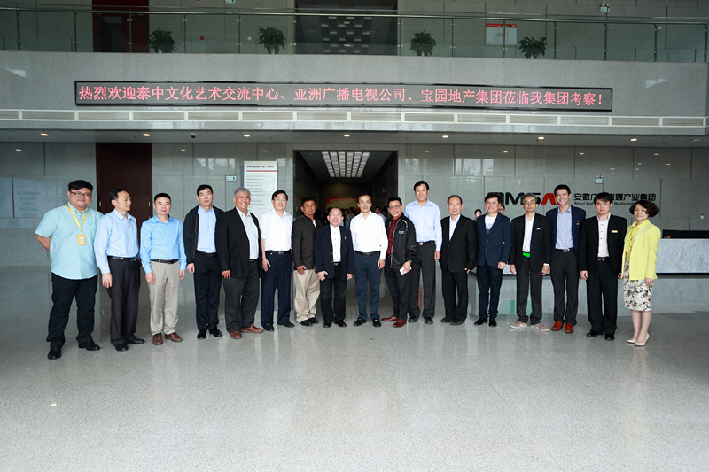 5月24日至26日,泰中文化艺术交流中心总裁吴南江,亚洲广播电视公司(泰国)执行总经理、“好生活频道”总经理南·隆砂娃,宝园地产集团(泰国)总裁黄来财一行来皖考察安徽广电集团及电视购物产业,洽商跨境商贸合作项目。省委宣传部副部长郭强会见了泰国考察团一行。集团党委书记、董事长聂庆义,集团总经理、副董事长、党委副书记沈天鹰,常务副总经理黄伟等陪同考察并与泰国考察团座谈交流。