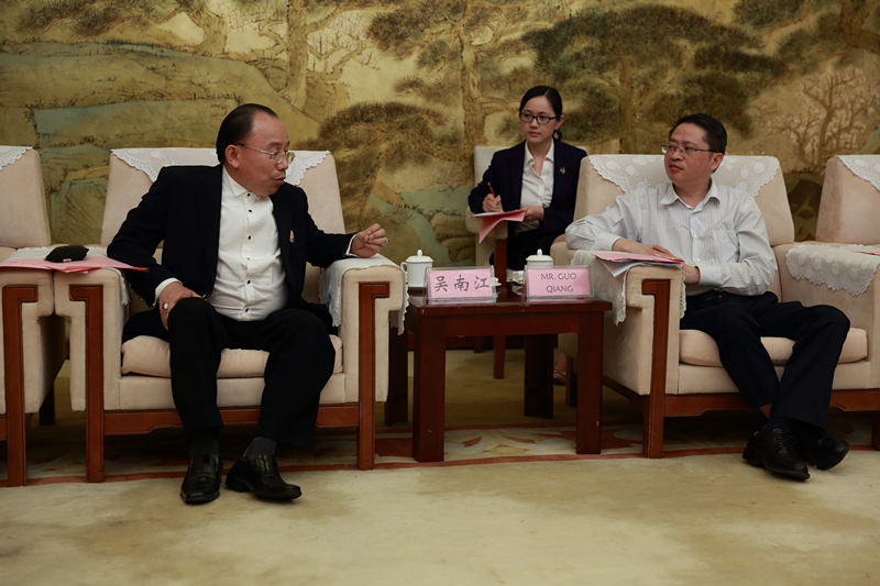 郭强对泰国考察团一行表示热烈欢迎,并简要介绍了安徽省情和广电集团基本情况。他指出,安徽省委、省政府高度重视我省文化产业走出去发展工作,始终坚持开放合作、和谐包容、市场运作、互利共赢的原则,与“一带一路”周边国家保持紧密联系,不断拓展经贸文化等合作领域。此次泰国考察团来皖与广电集团开展跨境电商商贸合作,省委宣传部高度重视,希望双方密切合作,尽快推动项目落地、开花结果,实现互惠共赢。安徽省委宣传部将给予大力支持,提供最好的服务。