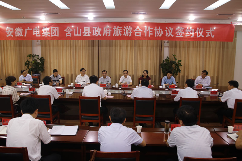 8月31日,安徽广电集团与含山县举行文化旅游合作框架协议签约仪式。省委宣传部常务副部长、省新闻出版广电局局长车敦安,马鞍山市委书记魏尧,马鞍山市委常委、宣传部长苏从勇等出席仪式并见证签约。集团党委书记、董事长聂庆义,含山县委书记卞建秋分别代表双方致辞。集团总经理沈天鹰与含山县县长田昕代表双方签约。