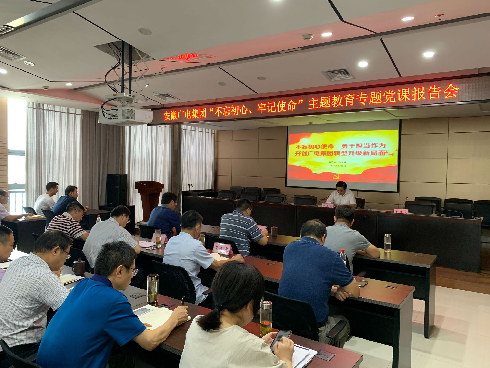 为贯彻落实中央和省委“不忘初心、牢记使命”主题教育工作部署,根据集团“不忘初心、牢记使命”主题教育工作安排,8月5日下午,集团党委副书记、副董事长、总经理沈天鹰同志为集团党员干部作题为《不忘初心使命 勇于担当作为开创广电集团转型升级新局面》的主题教育党课报告。集团党委副书记、董事袁超主持会议。省委第十四巡回指导组王锐同志出席。