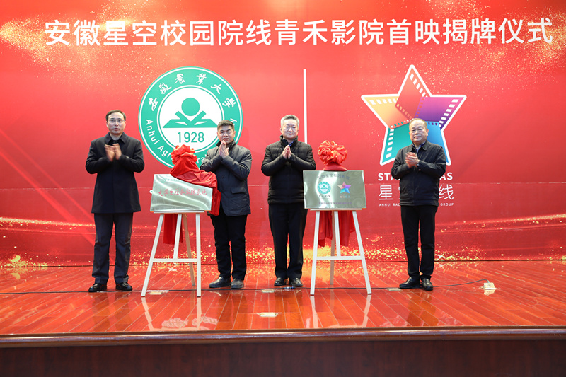 2020年12月31日,由安徽电影集团和安徽农业大学共同建设的“安徽星空校园院线青禾影院”揭牌首映仪式在图书馆第一报告厅隆重举行。安徽广电集团党委书记、董事长李树,安徽农业大学党委书记江春出席揭牌首映仪式并致辞。集团党委委员、工会主席胡滨,安徽农业大学党委中心组成员等出席揭牌首映仪式。