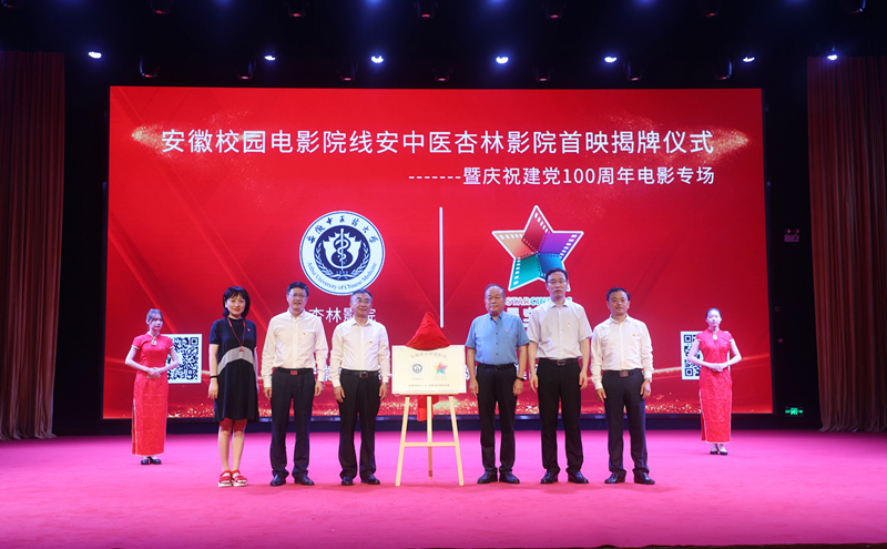 6月29日,安徽校园电影院线安徽中医药大学杏林影院揭牌首映仪式暨庆祝建党百年电影专场活动在大学生活动中心举行。集团党委书记、董事长李树,安徽中医药大学党委书记王先俊出席仪式并为影院揭牌。集团党委委员、工会主席胡滨,校党委常委、党委副书记张永群分别致辞。