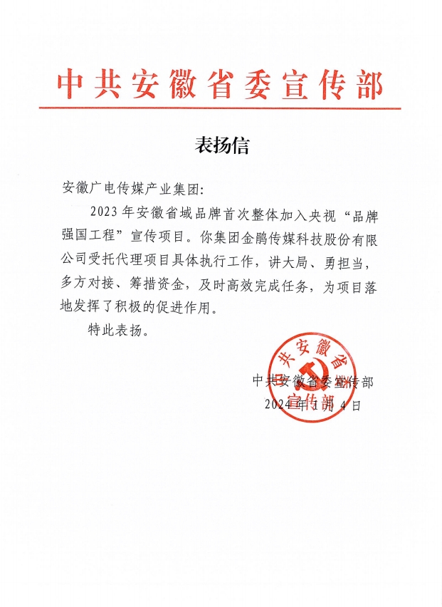安徽广电传媒产业集团: 2023 年安徽省域品牌首次整体加入央视“品牌强国工程”宣传项目。你集团金鹃传媒科技股份有限公司受托代理项目具体执行工作,讲大局、勇担当,多方对接、筹措资金,及时高效完成任务,为项目落地发挥了积极的促进作用。 特此表扬。 中共安徽省委宣传部 2024年1月4日