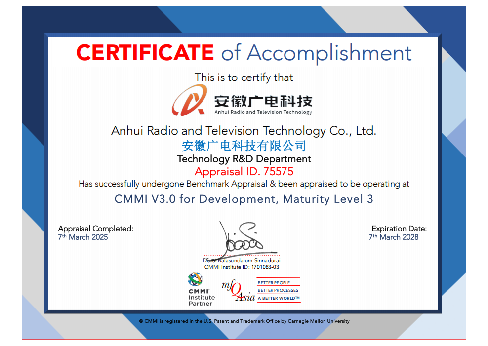 CMMI全称Capability Maturity Model Integration,即软件能力成熟度模型集成,是世界公认的软件产品的质量管理和质量保证标准。此次荣获CMMI 3级证书,标志着安徽广电科技公司在软件研发、项目管理及质量控制等方面达到行业先进水平,企业品牌价值进一步增强,竞标能力和客户信任度进一步提升。下一步,安徽广电科技公司将以更高标准推进技术创新、加快成果转化,持续赋能行业高质量发展,为智慧广电建设提供坚实技术支撑。