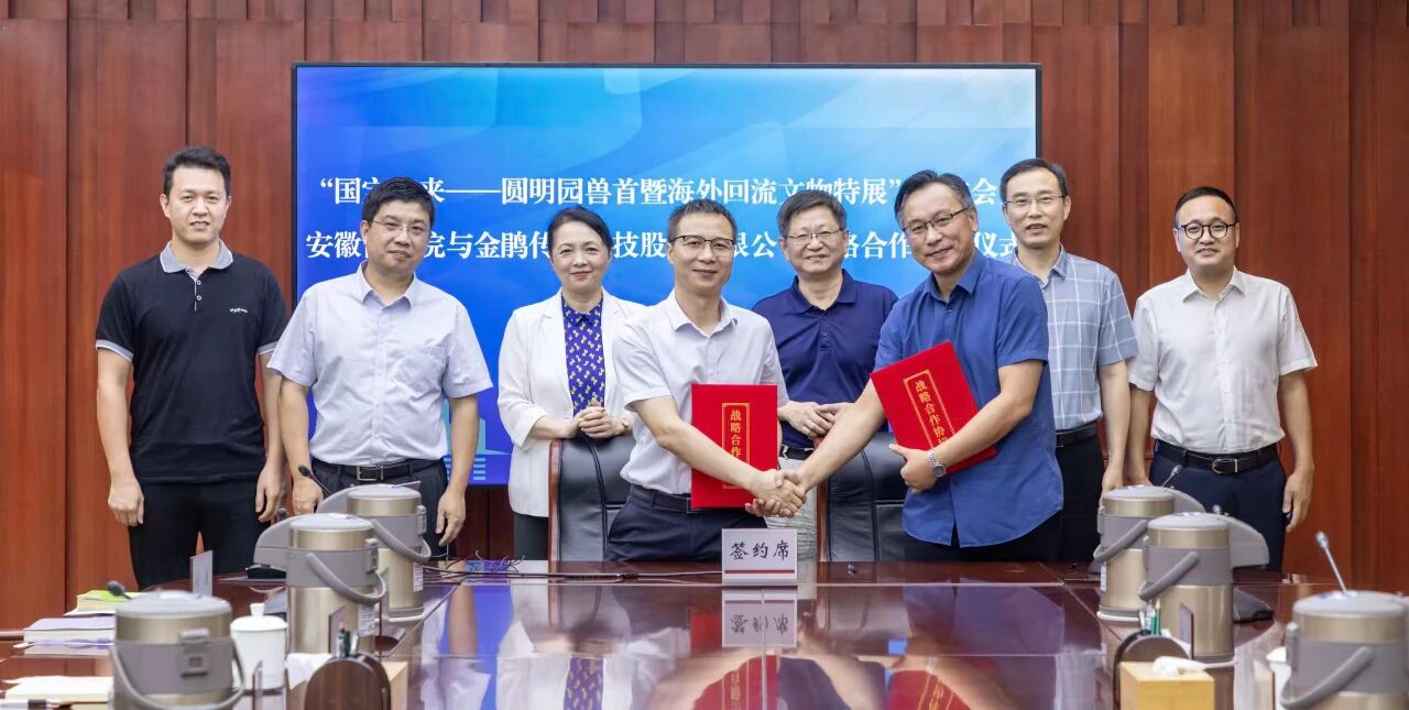 近日,“国宝归来——圆明园兽首暨海外回流文物特展”总结会暨金鹃传媒科技股份有限公司与安徽博物院战略合作签约仪式在安徽博物院举行。安徽广电传媒产业集团党委书记、董事长周玉,集团党委委员、副总经理胡滨,安徽省文化和旅游厅党组成员、副厅长兼省文物局局长胡敏,安徽博物院党委书记、院长雷修佛等出席签约仪式。
