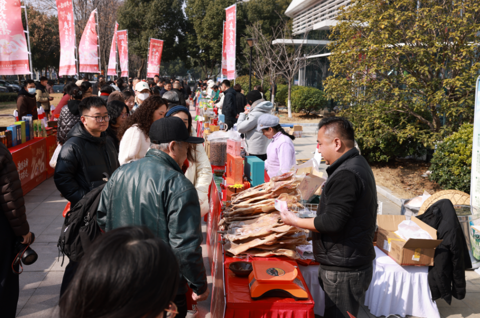 活动以“潮集高新·皋品直达”为主题,聚焦消费帮扶与文化惠民,打造了一场可逛、可品、可感的“家门口”年货盛宴。现场气氛喜庆热烈,来自六安大别山区的腊味、茶油、有机大米等农产品,与融入非遗元素的年俗文创产品共同构成四大主题展区。不少摊位前排起试吃长队,现场蒸制的腊味、即泡的六安瓜片和霍山米斛鲜粉即冲香气四溢,吸引众多高新区职工与市民驻足品鉴选购。