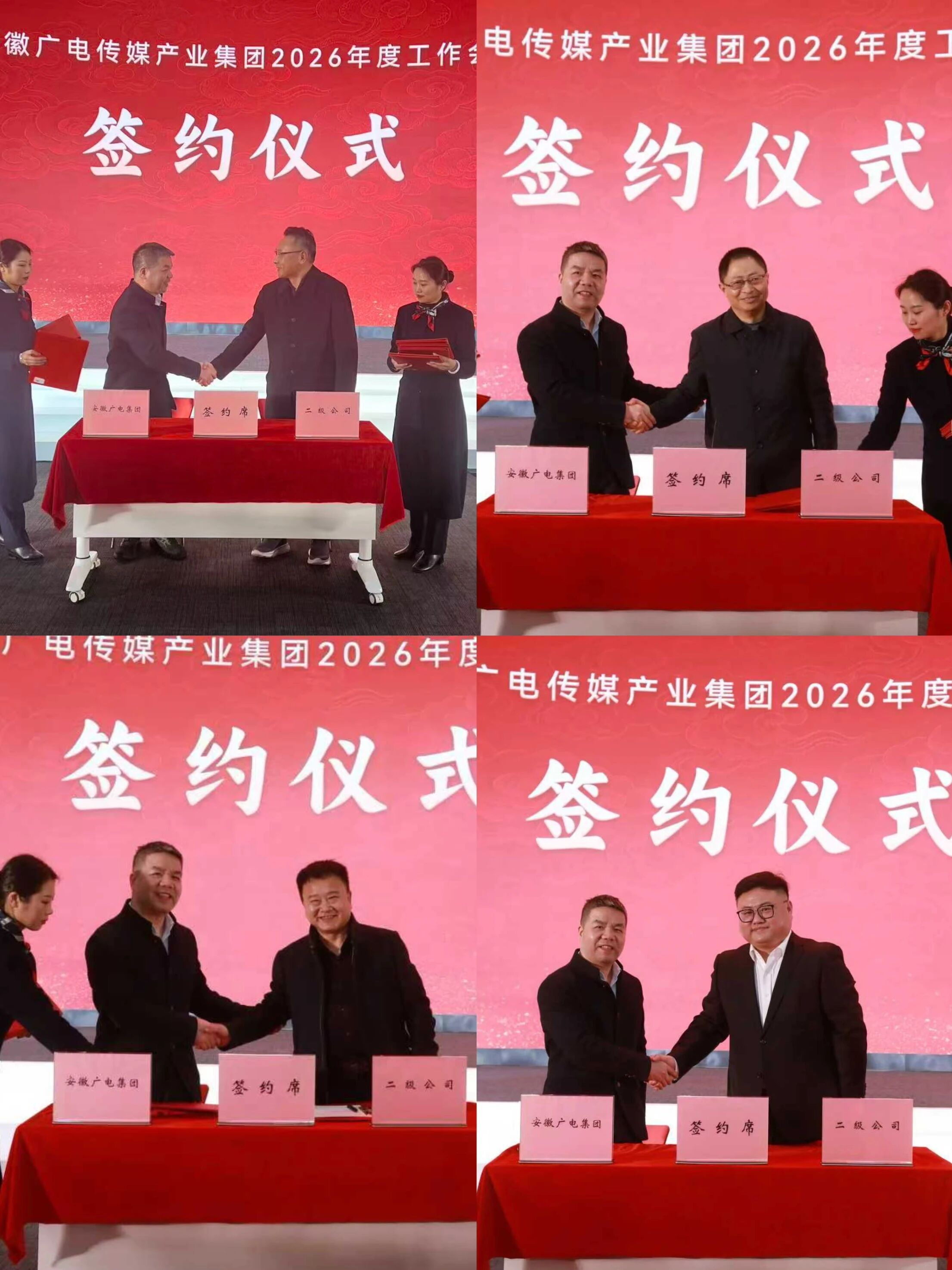 2月13日,安徽广电传媒产业集团2026年度工作会议在合肥市中安创谷全球路演中心召开。集团党委书记、董事长周玉作题为《迎难而上 向新向优 奋力开创集团高质量发展新局面》的讲话。集团党委副书记、董事、总经理苗峰代表集团与二级公司主要负责人签订2026年生产经营及安全生产责任书。集团党委副书记、董事王刘生主持会议并宣读《关于表彰集团2025年度先进集体、优秀个人的决定》,会议表彰了4个先进集体和20名优秀个人。集团党委委员、纪委书记、监察专员陈德友传达省直宣传文化单位党风廉政建设会议精神。集团领导班子成员、外部董事和全体干部职工出席会议。