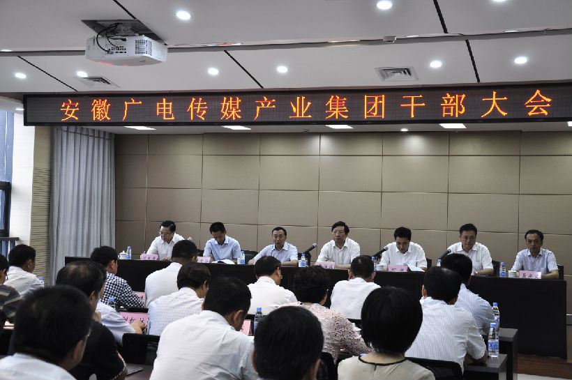 8月18日下午,安徽广电集团召开干部大会。省委常委、宣传部长曹征海同志出席会议并讲话。省委组织部副部长何军宣布了省委、省政府和省委宣传部关于集团主要负责同志职务调整的决定:聂庆义同志为集团董事长、党委书记,沈天鹰同志为集团总经理、副董事长、党委副书记。省委宣传部副部长、省新闻出版广电局局长车敦安出席。省委宣传部副部长、省文明办主任贺懋燮主持。省委宣传部副巡视员、秘书长邵晓晖出席。