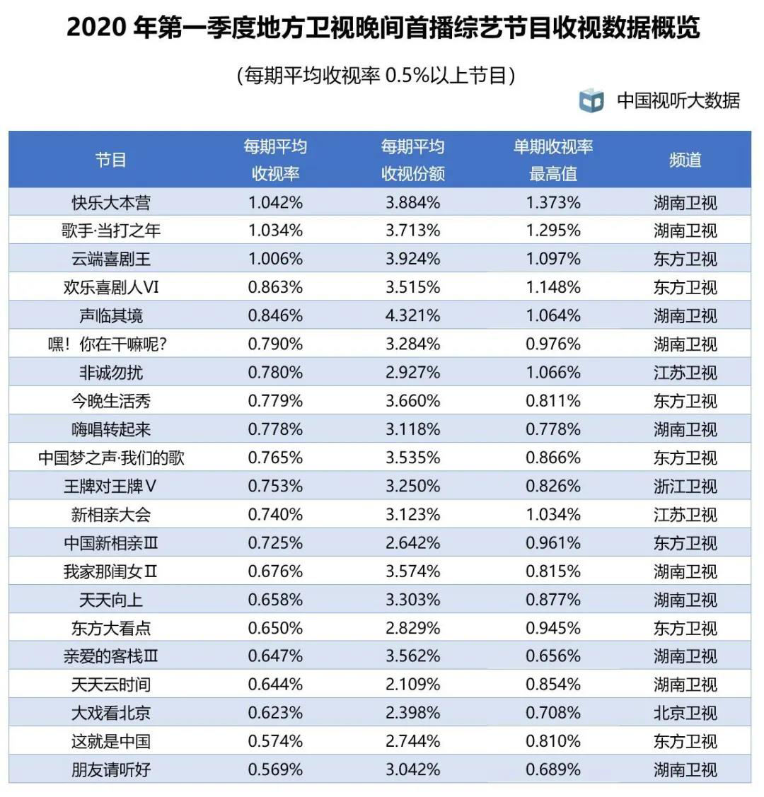 一季度,各频道迅速应对疫情,创新节目录制模式,积极满足群众居家防疫精神文化需要。地方卫视综艺方面,《快乐大本营》《歌手·当打之年》《云端喜剧王》《欢乐喜剧人Ⅵ》《声临其境》《非诚勿扰》《新相亲大会》单期收视率超过1%,21档综艺节目每期平均收视率超过0.5%。