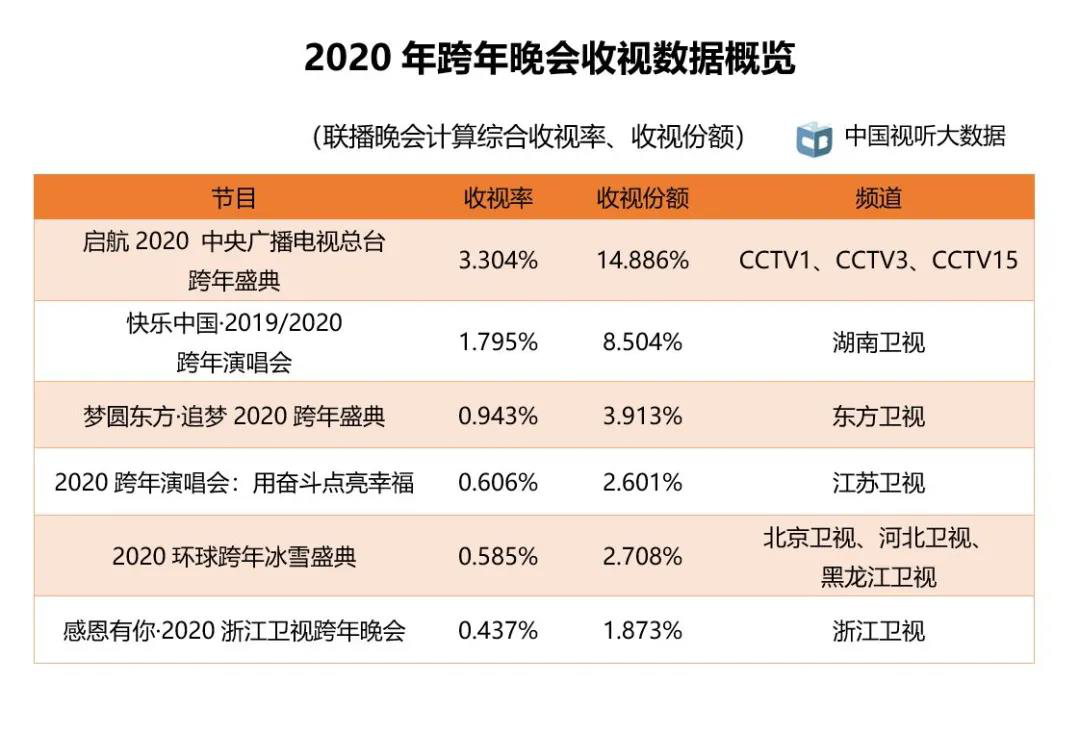 2019年12月31日晚,中央广播电视总台和地方卫视频道为观众献上了6场主题鲜明的跨年晚会,颇受观众喜爱,获得了可喜的收视成绩。中央广播电视总台《启航2020中央广播电视总台跨年盛典》综合收视率3.304%,收视份额14.886%;地方卫视5场跨年晚会收视位列当日地方卫视同时段开播所有节目前5,湖南卫视以“快乐中国”为主题的跨年晚会收获1.795%的高收视率,收视份额达8.504%。
