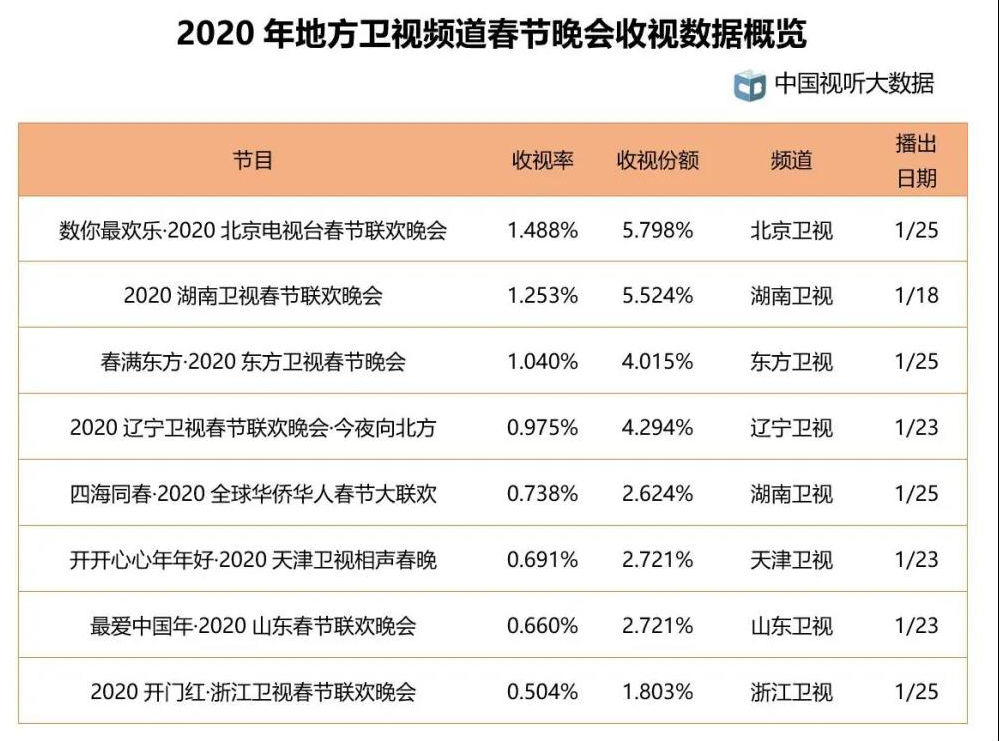 除此之外,湖南卫视《四海同春·2020全球华侨华人春节大联欢》、天津卫视《开开心心年年好·2020天津卫视相声春晚》、山东卫视《最爱中国年·2020山东春节联欢晚会》、浙江卫视《2020开门红·浙江卫视春节联欢晚会》收视率均超过0.5%。