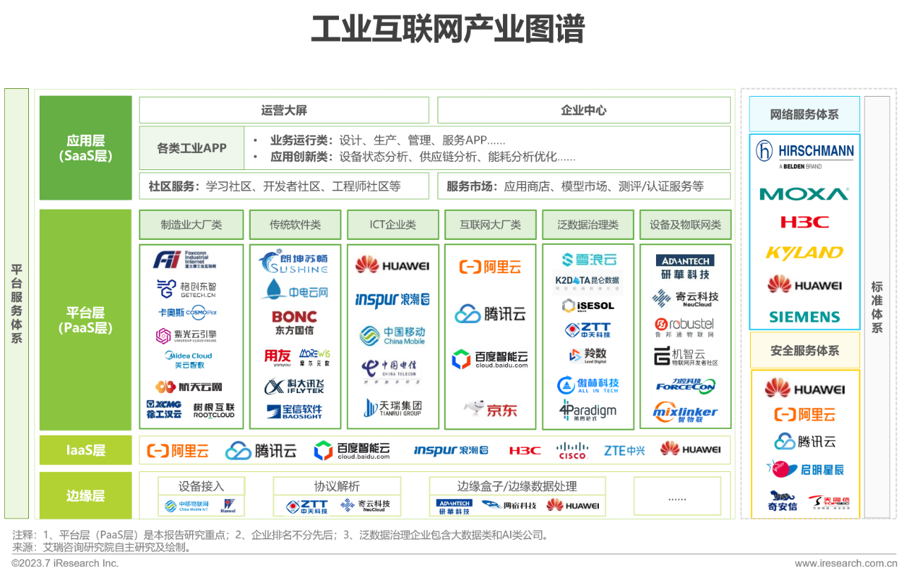 工业互联网玩家涵盖平台服务、网络服务、安全服务及标准服务四个体系,其中平台服务玩家主要集中在平台层(PaaS层)