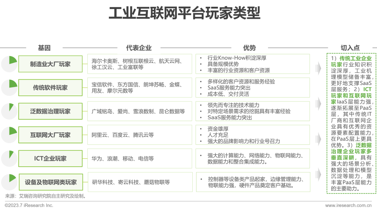 由于中国工业互联网平台市场目前仍处于初步发展期,供给方仍然以规模性的大企业为主,这些企业技术底蕴较深、服务经验丰富、资金雄厚且具有一定行业影响力。占据主要市场份额的玩家中,可以根据企业基因类型分为制造业大厂玩家、传统软件玩家、互联网大厂玩家、ICT企业玩家(包含传统IT厂商和电信运营商)、泛数据治理玩家和设备及物联网类玩家六类。不同基因给玩家带来的优势和路径各不相同,如制造业大厂,一方面,行业know-how理解深,行业经验相对容易沉淀为机理模型;另一方面,企业本身就是需求方,产品及服务可能更容易满足需求方的需求属性;ICT和互联网企业玩家基础设施底座能力强;泛数据治理企业垂直深耕能力强,是PaaS层的主要构成者。
