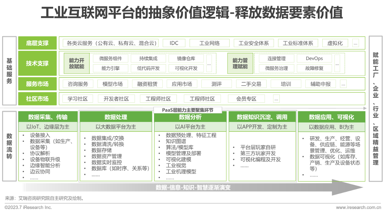 工业互联网平台的核心是释放企业经营活动形成的数据资产的价值,其中“数据从哪里来、数据怎么用、数据价值如何构建”等是平台企业需要考虑并解决的主要问题。当前市场上工业互联网平台企业主要具备两大类能力:其一,基础服务能力(如底层支撑、技术支撑),其通用属性更强;其二,围绕数据生命周期提供服务,覆盖数据采集及传输-数据处理-数据分析-数据知识沉淀及调用-数据可视化应用等全周期,涵盖物联网、大数据、AI等各类技术,其中数据分析、数据知识沉淀的专用属性更强,也是行业壁垒、企业服务壁垒的重要体现。从输出的服务体系来看,工业互联网平台服务商已初步形成PaaS平台底座+生态共筑、应用APP、综合解决方案等服务。