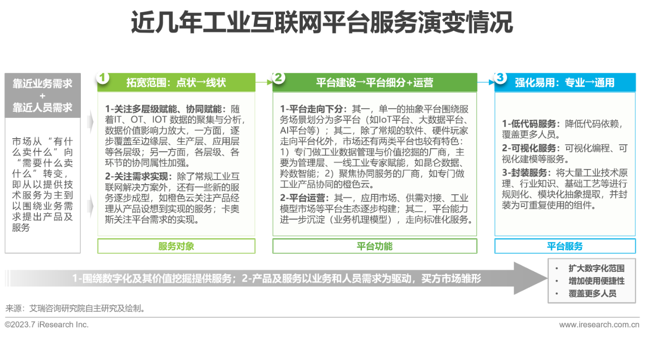 围绕数据资产价值挖掘及赋能是工业互联网平台服务的本质,近几年并未变化。随着平台逐步进入运营阶段,平台服务的本质虽未变,但平台能力向两方面延伸:其一,平台服务的边界、广度不断拓展;其二,平台能力丰富的同时,平台工具也走向简化。