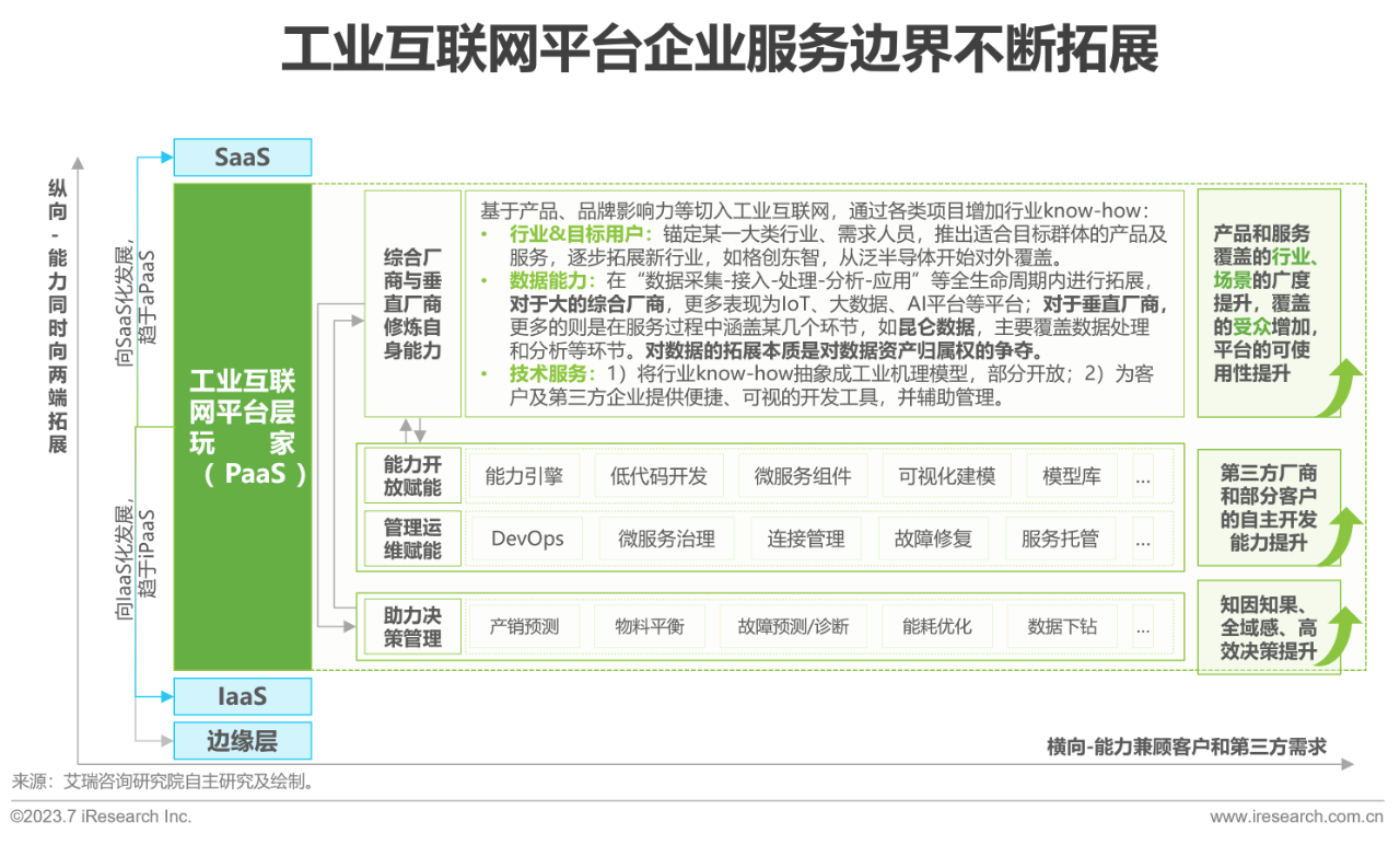近几年,随着工业互联网平台层企业服务客户的经验积累,对市场需求认知加深,平台层企业对自身能力构建的认知相对更加清晰,对外表现为服务能力走向细分的同时,其服务的边界不断拓展,具体表现为:1)从横向看,平台层企业主要从行业&目标用户、数据服务能力、技术服务能力三方面发力,对于前两种能力,其路径多为一到多,逐步拓展;对于第三种能力,往往需要经过一定积累后,逐步对外开放,且纯技术的开放更多的是综合厂商平台;2)从纵向看,部分平台层企业能力逐渐向aPaaS和iPaaS能力演进,且多为横向拓展驱动纵向拓展。