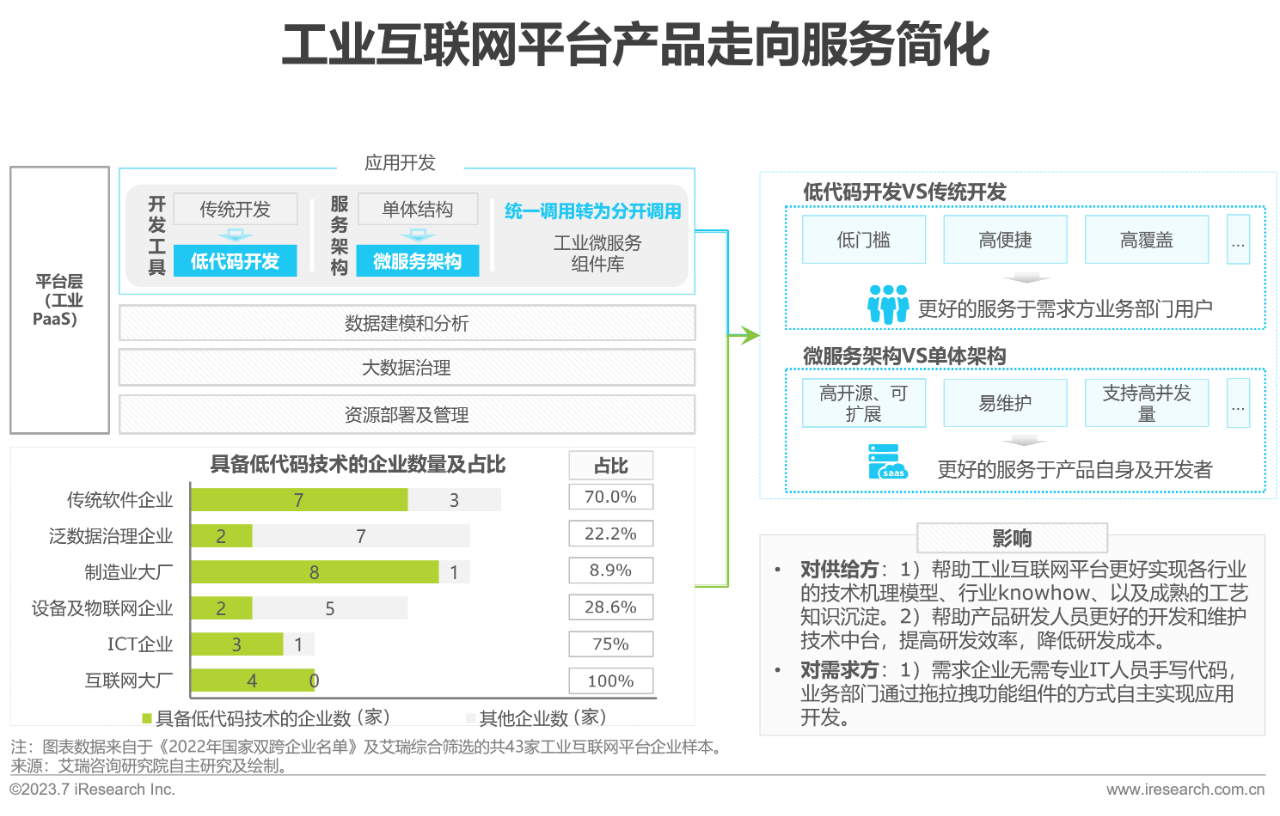 平台由单体架构走向微服务架构、传统代码开发走向低代码开发,应用开发模式逐渐走向低门槛、高开源、高便捷,平台产品的服务形式相对简化,主要好处有两点:1)加强产品架构的可扩展性和易维护性;2)扩大开发者覆盖范围。以上两点,对供需企业双方都有裨益:对供给方,实现工业机理高效地沉淀和调用的同时,还有利于研发人员更好地优化开发和维护;对需求方,能帮助懂生产制造等核心环节但无编程经验的业务人员实现自主开发,实现需求方的高效应用及管理。