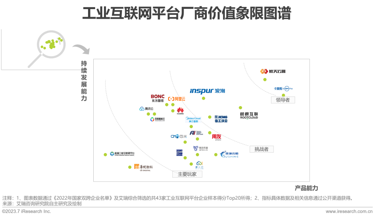 整个工业互联网平台玩家类型多样、玩家背景也较为复杂,各家企业都依托自身基因或背景优势占据一定的市场。本报告从产品能力和持续发展能力两个维度出发,筛选了前20名的企业,他们主要具有如下2个特点:1)各玩家无论在产品和服务能力、渠道关系、品牌综合影响力等方面,各家均有所长,故整体而言玩家差异并不大,尚未形成绝对的头部企业,你追我赶之势明显;2)政府关系紧密、通过政府合作拓展区域影响力、市场发声频繁等是现阶段相对领先的企业的主要竞争手段。