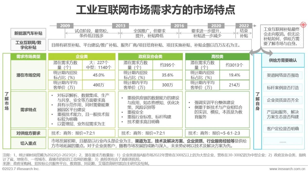 与新能源行业类似,工业互联网/数字化的补贴也将经历从宽松到收紧、从高补贴到低补贴,甚至是取消补贴的过程。就工业互联网市场长期发展而言,无论补贴持续时间多久,未来是否存在,供给方最终都需要满足用户的需求。因此供给方企业都需要结合渠道关系、技术及解决方案、企业资质、行业服务经验等市场拓展重点,明晰自身优势,确认产品及服务特点,锚定适合自身的赛道和客户,方能适应市场变化。
