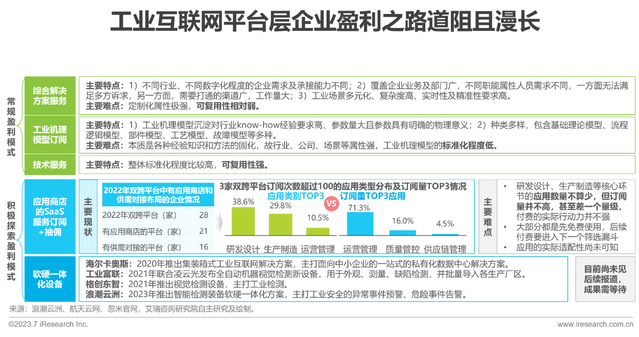 当前工业互联网市场大多是“赔钱赚吆喝”,新的变现模式正在不断探索。但就目前而言,盈利变现依然道阻且艰。除去常规的综合解决方案等盈利模式外,目前平台分发抽佣+软硬一体化设备两大类模式为企业所积极探索。针对分发抽佣,目前呈现对平台的生态贡献可能远高于盈利贡献的特点,其主要原因是研发设计、生产制造等核心环节本身的复杂性太高、企业差异性太强,应用的适配性不高。据不完全统计,在订阅次数超过100的应用中,研发设计、生产制造的应用数量占据TOP2,占比达68.4%,但就订阅总数而言,运营管理呈绝对优势,占比达71.3%,这也说明用户更趋向于为解决实际需求付费。针对软硬一体化,目前依然处于探索期,早前有报道,但现阶段尚未看到后续报道,究竟是折戟沉沙,还是即将大获全胜,我们拭目以待。