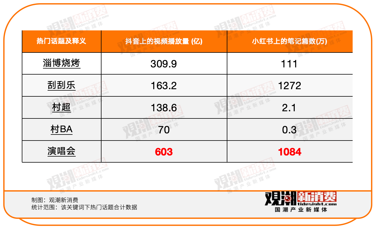 演出结束后,许多观众会在社交媒体上分享他们的票根、现场照片和评论,表达自己的感受。根据观潮新消费在主流社交媒体平台的数据统计,在抖音、小红书等社交媒体平台上,演唱会播放量和笔记篇数普遍领先其他热门话题。