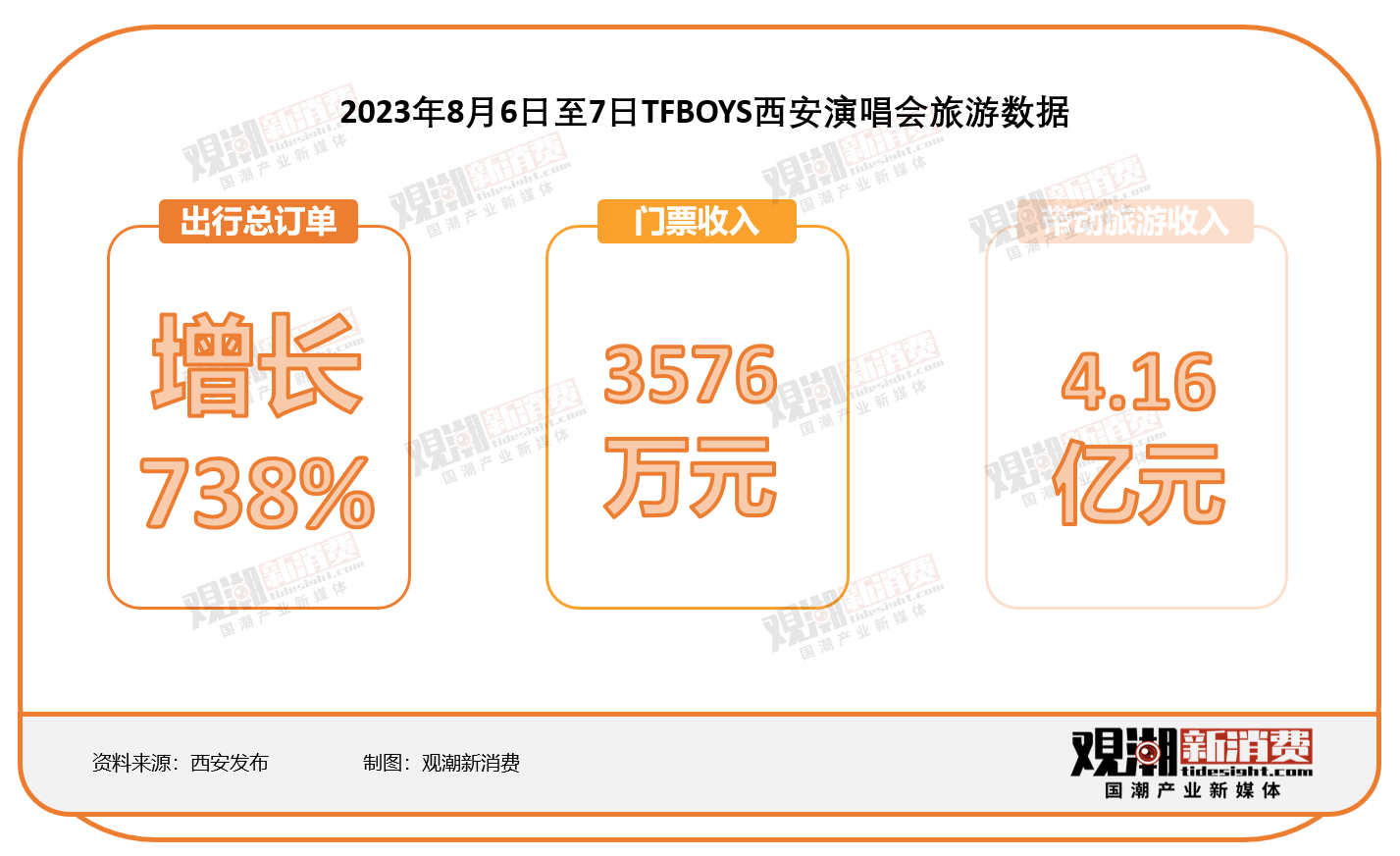 2023年8月6日晚,TFBOYS“十年之约”演唱会在西安奥体中心体育场举办,门票收入3576万元。据第三方抽样调查统计,本场演出前后,西安住宿线上提前预订量同比大幅增长,8月6日-7日出行总订单量同比增长738%;直接带动4.16亿元的旅游收入。