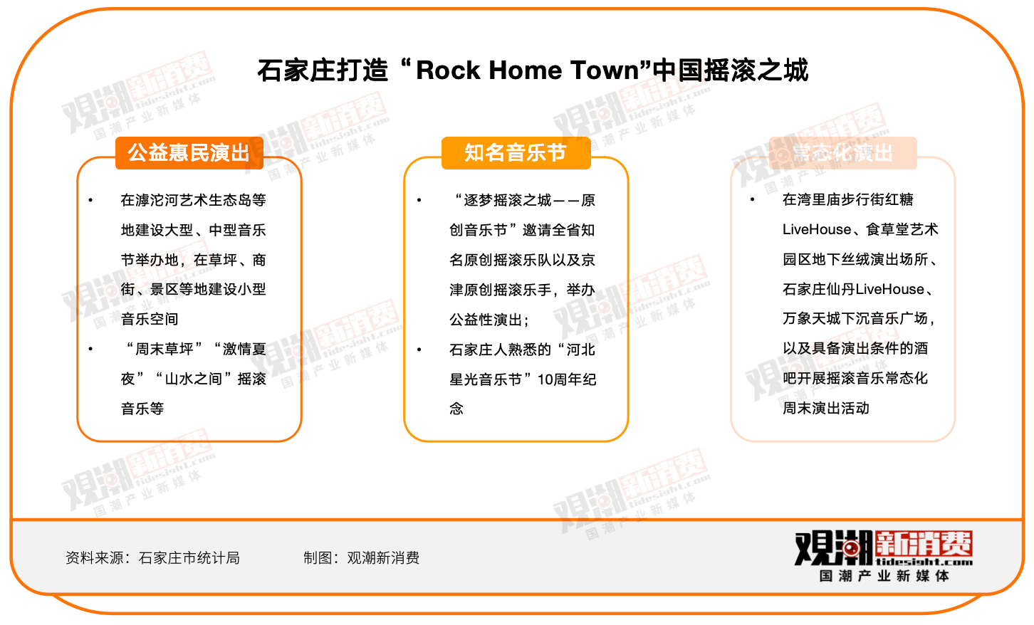 北京在2023年的政府工作报告中首次提出要“努力打造‘演艺之都’”;石家庄市则高调宣布要成为中国的“摇滚之城”,并在2023年7月至10月举办了一系列摇滚音乐演出活动……