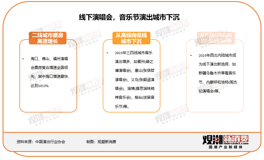 中国演出行业协会发布的《2023上半年全国演出市场简报》透露,2023年,三、四线城市的音乐演出数量有所增加;在地域分布上,西北内陆城市也开始成为线下音乐演出的新选择,其中以新疆乌鲁木齐音乐节为代表。