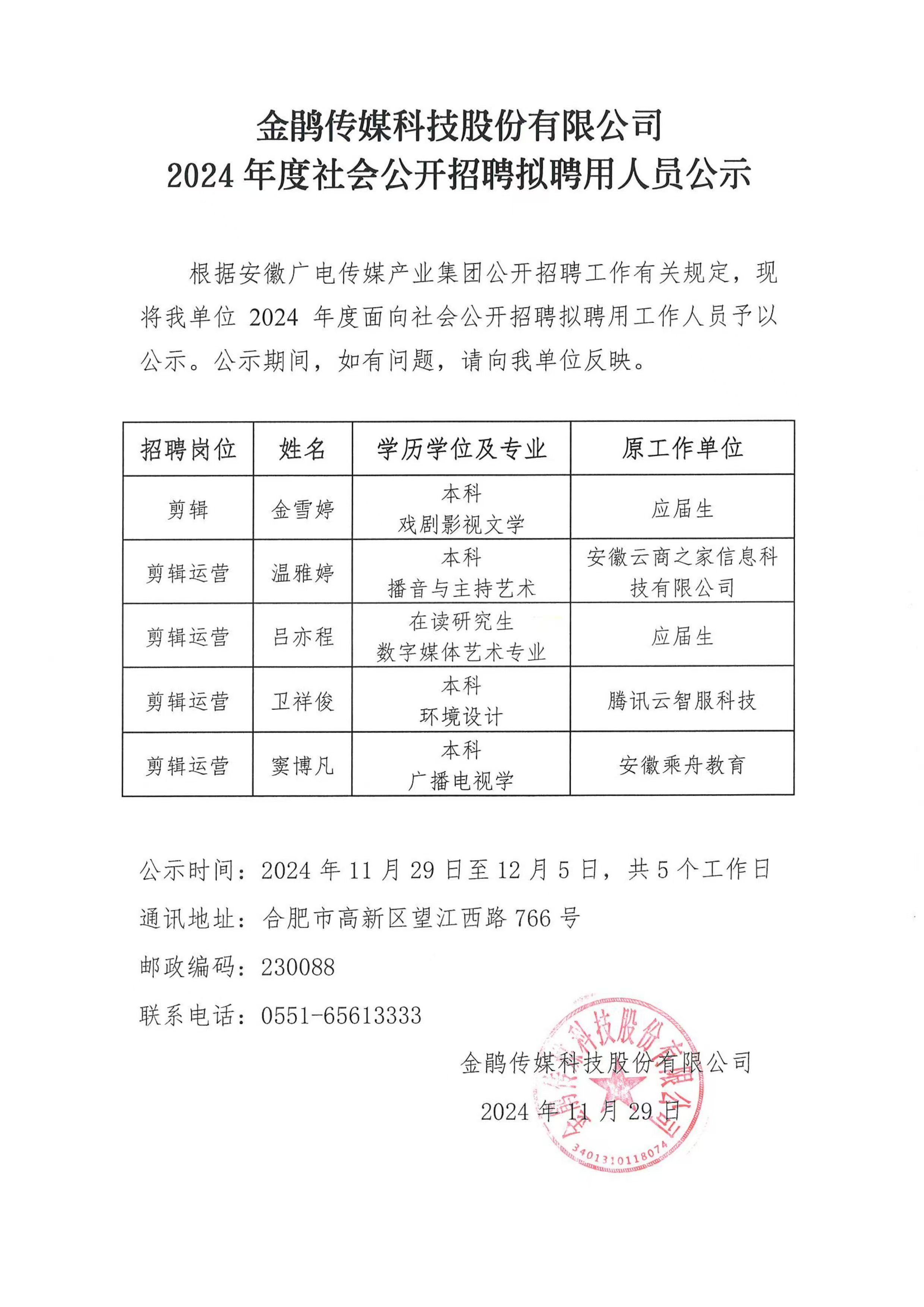 金鹃传媒科技股份有限公司2024年度社会公开招聘拟聘用人员公示