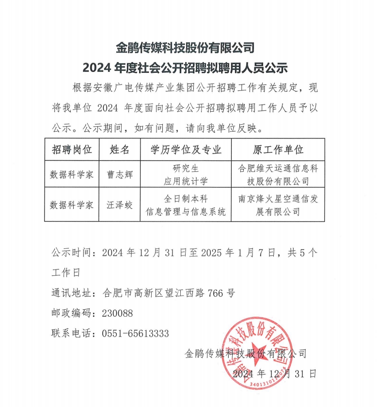 金鹃传媒科技股份有限公司2024年度社会公开招聘拟聘用人员公示